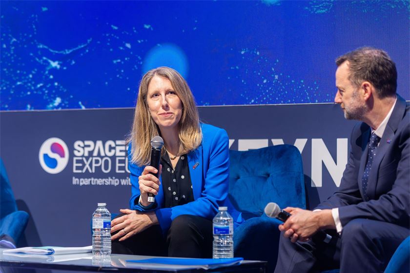 New director Rebecca Evernden with former boss Paul Bate at Space Comm Expo Europe event. Photo: Avpics/Alamy